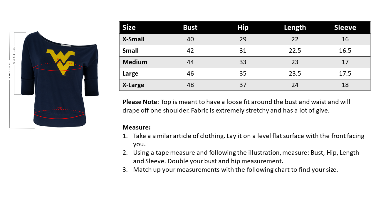 This WVU top is feminine yet extremely comfortable. Crafted from a soft blend, this loose dolman top features a flaunting one-shoulder draped neck, airy dolman 3/4 swing sleeves and a banded waistband for a snug feminine fit. Perfect for any occasion, whether your cheering on the Mountaineers in the blue lot on game day or watching the game at a friends house.