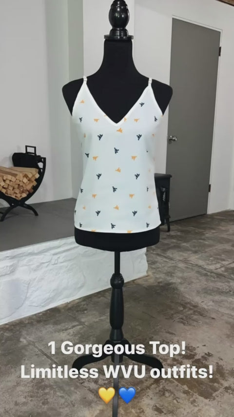 One top, limitless outfits. This WVU tank has a beautiful V-Neck and adjustable straps. It pairs perfectly with a Gold or Blue cardigan, jeans/shorts and sneakers or dress pants. Support the West Virginia Mountaineers no matter the occasion.