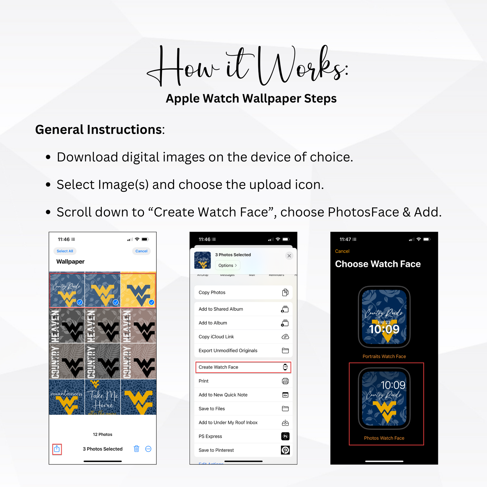 These West Virginia University apple watch faces are the perfect addition to your outfit and show your Mountaineer pride everyday. You can download them immediately after purchase.